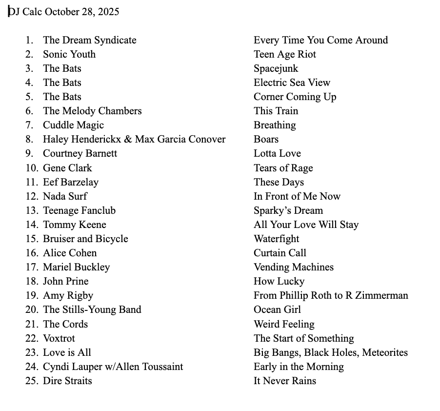 Not too much to say about tonight’s set. I included an Amy Rigby song – mad at myself for not traveling to see her last week in Kingston, NY. I featured The Bats who have a terrific new album out.