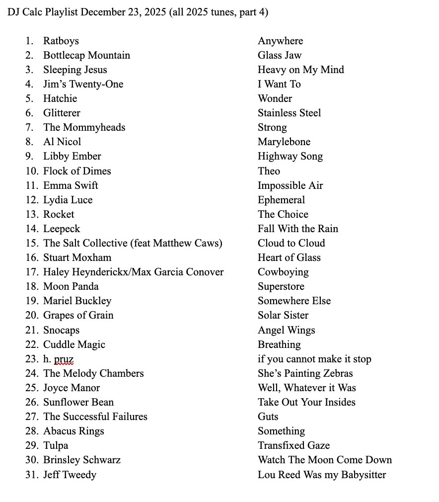 My tour of the highlights of 2025 continues tonight (part 4) with one more Tuesday left in the year. It’s been fun unearthing artists I knew little about and scouring through the many files shared with our station and with the files I bought over at Bandcamp during the year. Below is the playlist and the audio link for the show tonight.