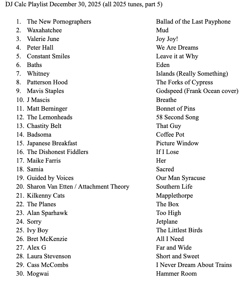 Tonight’s show closes out my five part tour of 2025 highlights. So much good music this year and there are many tunes I love that did not make it into this month’s playlists. Below is the setlist and the audio file for the show.