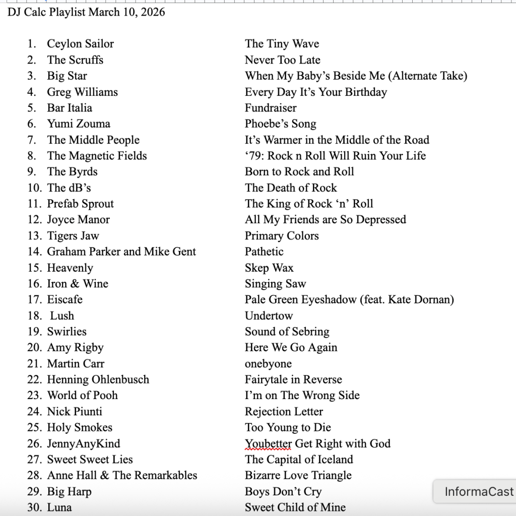 I have to admit I am kind of proud of the silly set conceit from tracks 8 – 11. I also worked in an all covers set for the first time this year to close out tonight’s show.